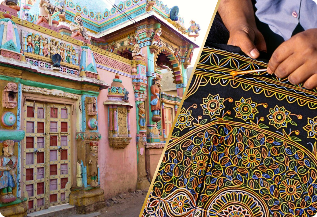 さらに、ホドカ村・カヴダ村・ニローナ村などの伝統工芸の村では、刺繍・銅ベル・ロガンアートといった手しごとの温もりに触れ、
