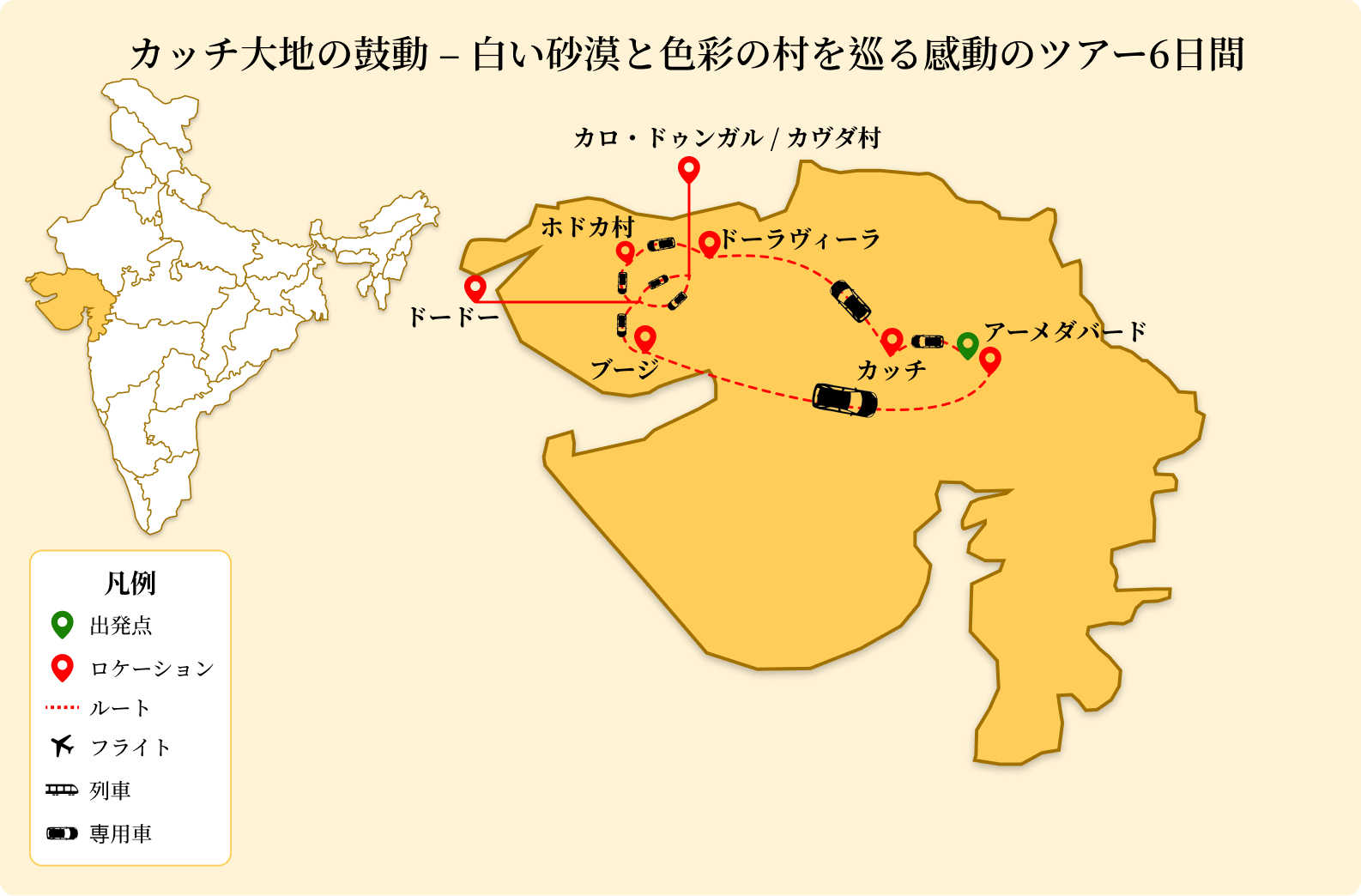 • このツアーでは、カッチ地方の大自然や伝統文化を存分に味わうために、
